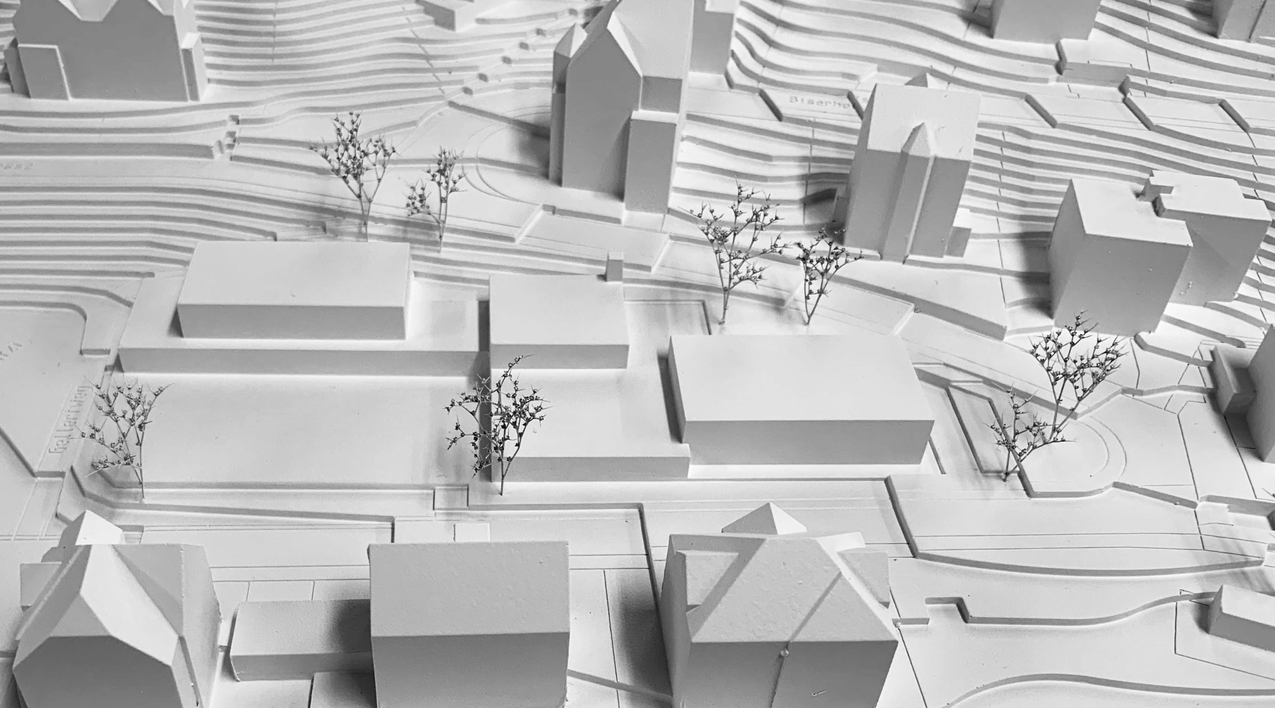 Mit dem nahtlosen Anbau der Kindertagesbetreuung an die bestehende Sporthalle mit Kindergarten wird die leichte und durchlässige Bebauungsstruktur aus den 50-er Jahren weitergeführt und gleichzeitig der Abschluss der öffentlich zugänglichen Gesamtanlage gegen Süden, beziehungsweise den Strassenraum, definiert. Dadurch fügt sich der Neubau wie selbstverständlich in die Topografie ein und der heutige Ausdruck und Charakter der Gesamtanlage wird beibehalten. Zusätzlich entsteht auf der Dachfläche des neuen Erdgeschosses, zwischen dem bestehenden Kindergarten und dem Kinderhort, ein neuer geschützter Aussenraum.