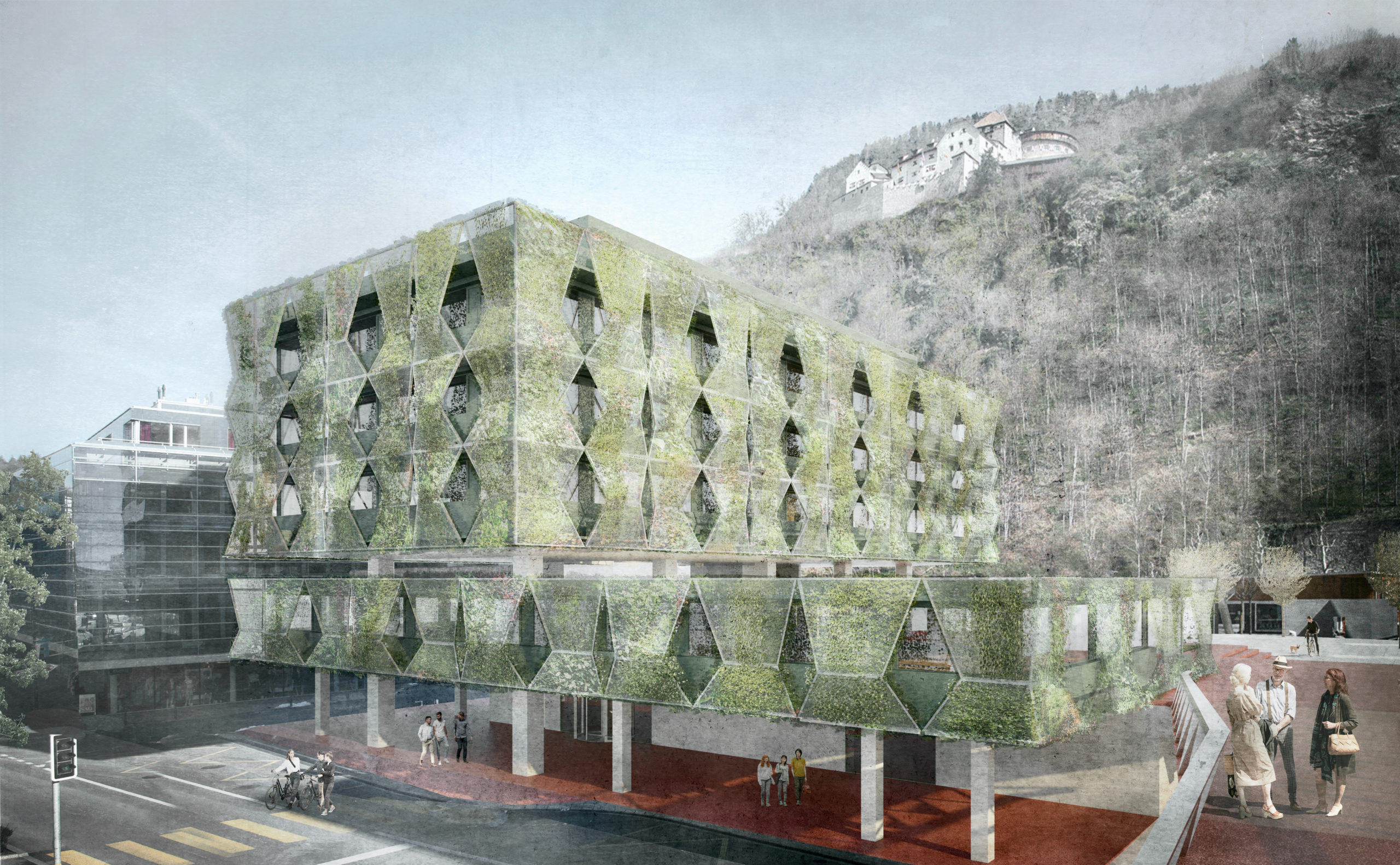 Die begrünte Hülle aus Kletterpflanzen, Kleinsträuchern und Stauden schützt den Baukörper zudem vor Sonneneinstrahlung und extremer Witterung, indem Temperaturspitzen und der Wind abgeschwächt werden. Darüber hinaus reduziert die Grünmasse an Hitzetagen die Temperatur und erhöht die Luftfeuchtigkeit in der unmittelbaren Umgebung. In der prominent gelegenen, dicht bebauten und belebten Städtle-Fussgängerzone wird damit auch ein zeitgemässes, ökologisches und lebenswertes Zeichen gesetzt.